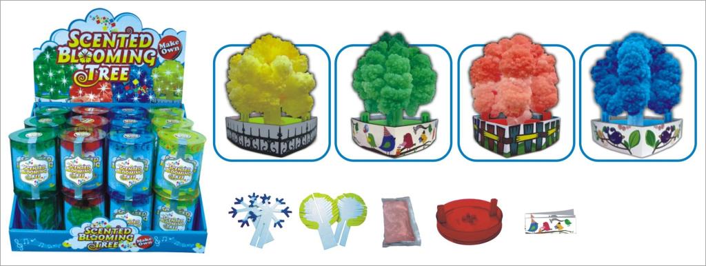 PACHNĄCE, KWITNĄCE DRZEWKO - To magiczne drzewko, które po skonstruowaniu (złożeniu a następnie uformowaniu pożądanego kształtu korony zgodnie z instrukcją) i po napełnieniu podstawki załączonym roztworem ciekłego kryształu, rozkwita na naszych oczach roztaczając wokół piękny zapach. W jednym opakowaniu dostępne są dwa drzewka. W zależności od koloru opakowania mają one zapach lawendy, mięty, orchidei lub jaśminu.