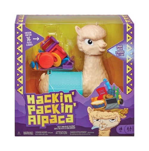 Paki Alpaki – przezabawna gra dla dzieci – z mnóstwem bagaży i „plującą” wodą alpaką! Zabawa polega na układaniu bagaży na grzbiecie Ala. Róbcie to szybko – ta alpaka jest niecierpliwa! Aby rozpocząć, naciśnij głowę Ala i uruchom odliczanie. Podczas swojej kolejki masz kilka sekund, aby położyć sztukę bagażu na grzbiecie zwierzaka. Jeśli nie zdążysz tego zrobić na czas, AL OPLUJE CIĘ wodą! Musisz użyć wszystkich swoich umiejętności i wykazać się zręcznością, by ułożyć bagaż – gra robi się tym trudniejsza, im więcej bagaży