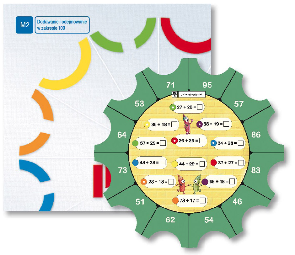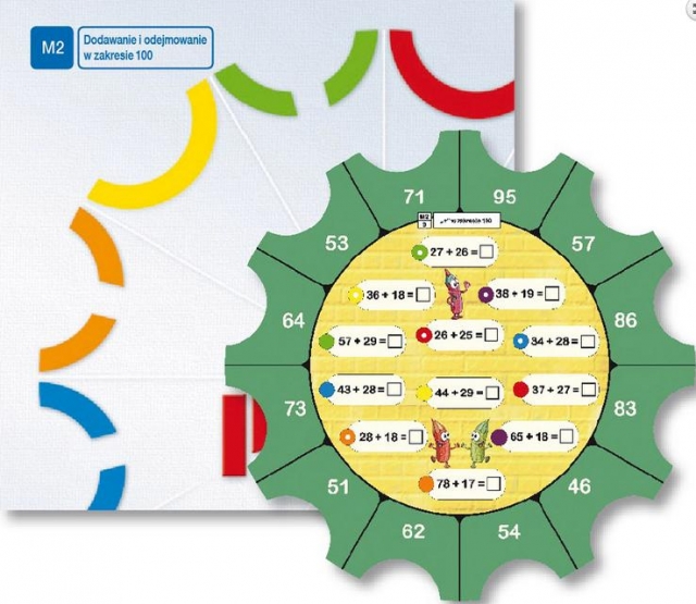Tarcze ćwiczeń M2 to komplet 12 tarcz ćwiczeń do "Palety" przeznaczonych dla dzieci w nauczaniu początkowym. Obejmują podstawowe działania arytmetyczne tj. dodawanie i odejmowanie w zakresie 100 bez przekraczania i z przekroczeniem progu dziesiątkowego, dodawanie i odejmowanie trzech liczb.