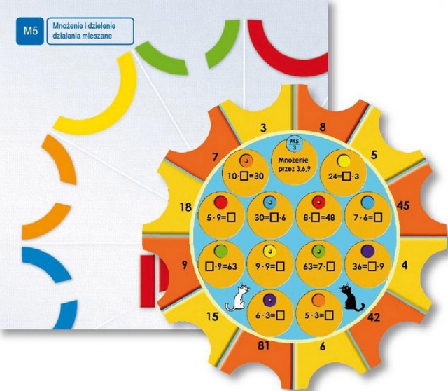 Tarcze ćwiczeń M5 to komplet 12 tarcz ćwiczeń do "Palety" przeznaczonych dla dzieci w klasach od 0 do III. Obejmują działania arytmetyczne tj. mnożenie, dzielenie, działania mieszane.