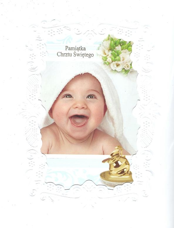 ""Mały A5"" to elegancka pamiątka przeznaczona na Chrzest Święty.   Całość wykonana z ozdobnego, wysokiej jakości, głęboko zmatowionego kartonu   wykończonego eleganckim pregiem.  Książeczka zawiera cytaty z wypowiedzi Sługi Bożego Jana Pawła II odnoszące   się do Chrztu Świętego.  Zostawiono miejsce na wpisanie informacji o   miejscu i dacie Chrztu Świętego oraz Rodzicach Chrzestnych Istnieje także   możliwość wklejenia dwóch zdjęć.