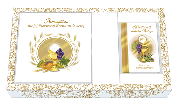 Pamiątka mojej Pierwszej Komunii Świętej jest bogato ilustrowanym albumikiem, w którym zapisać można najważniejsze wydarzenia oraz umieścić fotografie z uroczystości pierwszokomunijnej. Modlitewnik dziecka Bożego w złoconej oprawie zawiera wszystkie ważne modlitwy, mały katechizm, popularne pieśni oraz informacje dotyczące sakramentów świętych.