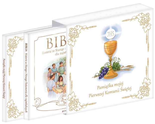 Wspaniały prezent z okazji Pierwszej Komunii Świętej. Komplet w ozdobnym etui zawiera dwie książki: Biblia. Historie ze Starego i Nowego Testamentu dla najmłodszych (opr. twarda, s. 64) Historie biblijne od wielu stuleci towarzyszą dzieciom i dorosłym. Opowieści zebrane w tej Biblii dla najmłodszych z pewnością poruszą serce każdego małego czytelnika. oraz album Pamiątka mojej Pierwszej Komunii Świętej (opr. twarda, s. 48), który oprócz urokliwych ilustracji, pięknych tekstów modlitw zawiera wiele miejsc do samodzielnego uzupełnienia, takich jak: ♦ informacje dotyczące Chrztu Świętego ♦ miejsce na fotografię z uroczystości chrzcielnej ♦ informacje dotyczące przygotowania do uroczystości pierwszokomunijnych ♦ miejsce na podanie ulubionej pieśni, modlitwy ♦ szczegóły uroczystej Mszy Świętej i miejsce na fotografię ♦ informacje dotyczące przyjęcia ♦ życzenia oraz wpisy bliskich osób.