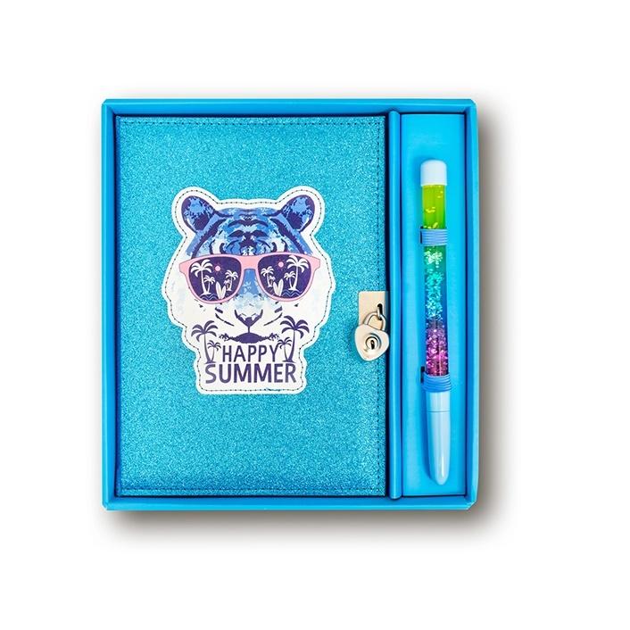 Zestaw zawiera niebieski, brokatowy pamiętnik oraz długopis z wodną dekoracją z konfetti. Pamiętnik ozdobiony jest podobizną tygrysa w okularach. Pamiętnik ma 80 stron w linie z ozdobnym nadrukiem. Całość zapakowana jest w eleganckie pudełeczko.