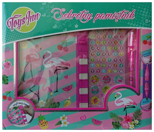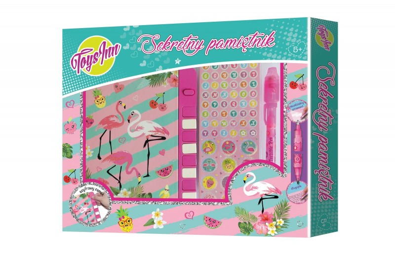 W zestawie pamiętnik z szyfrem, arkusz z naklejkami i długopis z niewidzialnym atramentem.
