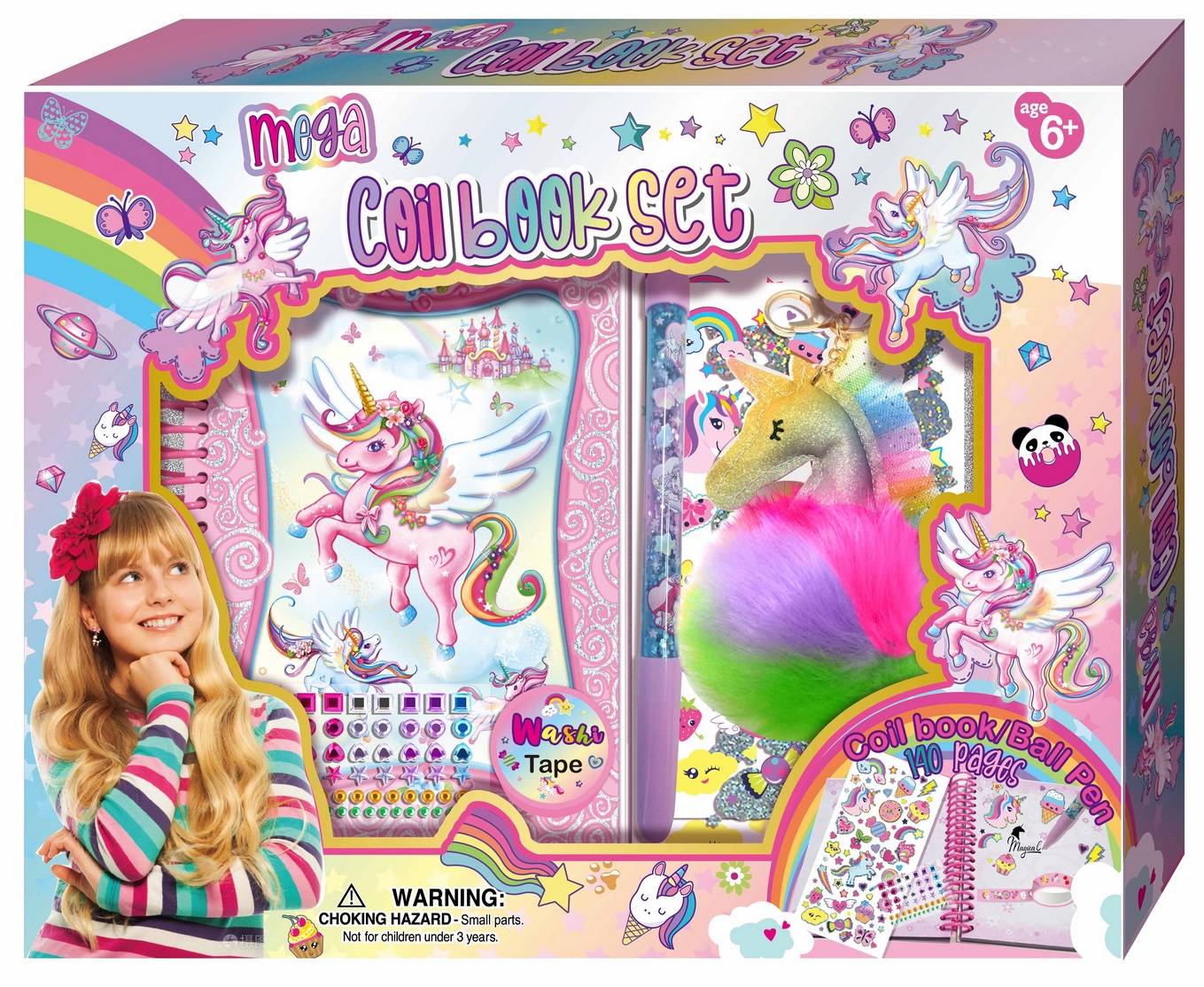 Zestaw zawiera: - pamiętnik kołozeszyt z kolorowymi kartkami - ozdobny długopis z cekinami - pluszowy breloczek - ozdobne naklejki kryształki - kolorowa dekoracyjna taśma klejąca Zestaw zapakowany w ozdobne opakowanie prezentowe. Wiek: 6+
