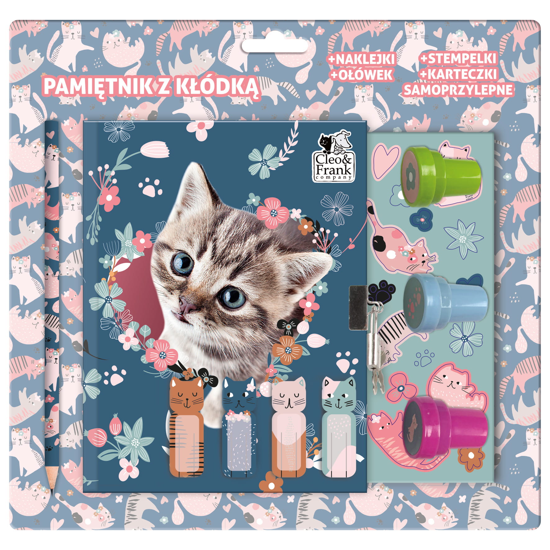 Pamiętnik z kłódką i stempelkami + zestaw przyborów Cleo i Frank Kot 41 DERFORM