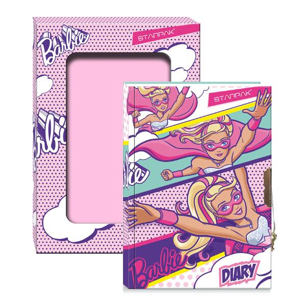 Pamiętnik zamykany z wizerunkiem ukochanej przez dziewczynki Barbie lub Super Barbie. Wyposażony w zamek i 2 kluczyki. W zestawie z pudełkiem prezentowym zamykanym na magnes. Dostępny w dwóch odsłonach graficznych.