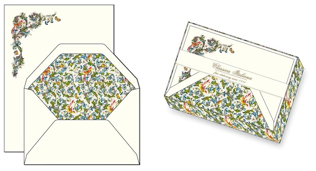 Papeteria w ozdobnym pudełku, papier o gramaturze 120g/m2. W zestawie znajduje się 10 kopert i 10 papierów listowych. Produkt z ekskluzywnej galanterii wyprodukowany we włoskiej manufakturze.