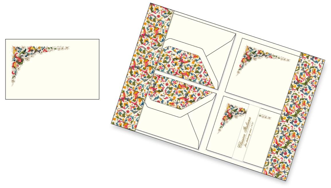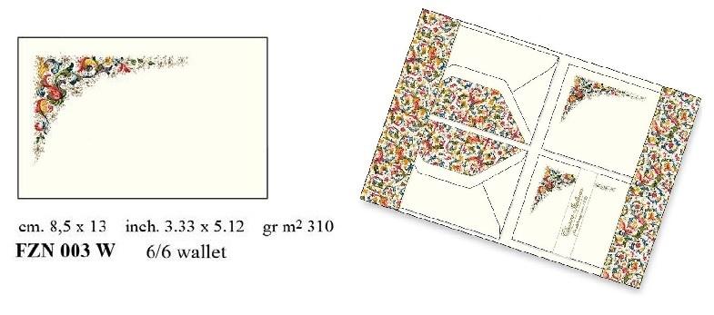 FZN 003W Papeteria Wallet 6 kopert i 6 kartek. Papeteria w opakowaniu typu Wallet, koperty posiadają zaznaczoną linię, papier o gramaturze 310/m2. Produkt z ekskluzywnej galanterii wyprodukowany we włoskiej manufakturze.