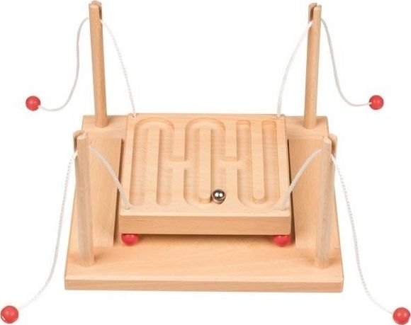 Zręcznościowe gry dla dzieci Goki pomagają rozwijać koordynację ruchową oraz motorykę, ale jednocześnie wskazują, czym jest prawdziwa kooperacja. Już najmłodsi uczą się podstawowych zasad współpracy, przedstawiania innym swoich pomysłów, a także rozumienia się bez słów w grupie rówieśników. W zestawie znajduje się drewniana podstawka z filarami, dwustronna plansza z 4 linkami i kulka, którą należy przeprowadzić przez labirynty. W zabawie może uczestniczyć od 2 do 4 osób. Poprzez odpowiednie naciąganie sznurków przechyla się powierzchnię toru by ostrożnie dotrzeć do jego końca.