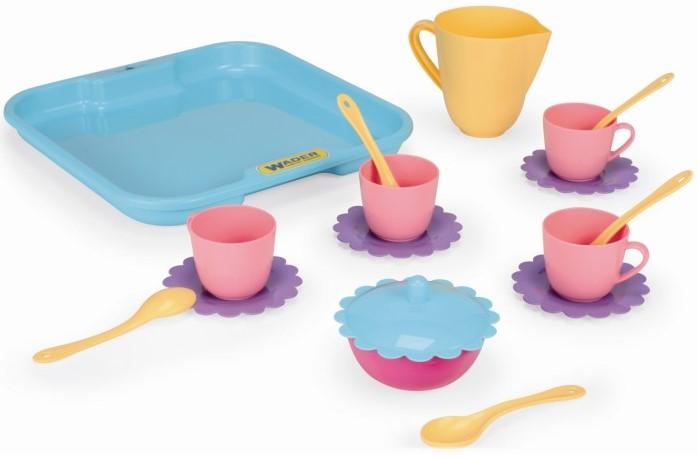 Praktyczny komplet naczyń dla idealnej małej Pani domu. Zestaw składa się z tacy oraz kompletu naczyń stołowych, w skład którego wchodzą między innymi: łyżeczki, filiżanki z podstawkami, oraz cukiernica z małym dzbankiem.