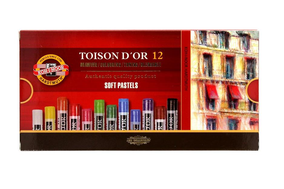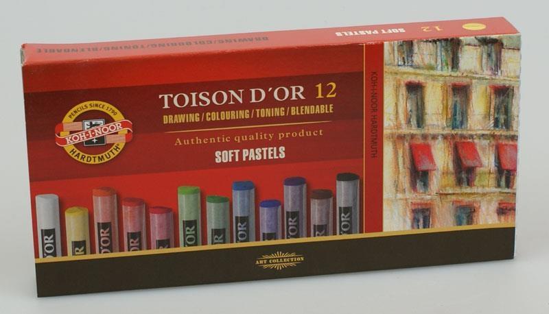 Pastele suche TOISON D'OR, dostępne w zestawach od 6 do 120 kolorów, kompletach 12 odcieni szarosci i brązu oraz na sztuki. Odznaczają się szeroką paletą trwałych kolorów i jednolitością pigmentu w masie pasteli. Są bardzo kruche i delikatne dzieki czemu świetnie się rozcierają, a przez co są bardzo podatne na złamaniai. Do rysowania pastelą zalecane jest używanie papieru z fakturą, gdyż łączy sięz podłożem tylko w sposób mechaniczny (mikro zagłębenia w fakturze papieru). Dlatego po ukończeniu pracę należy zabezpieczyć fiksatywą lub przykryć szybą.