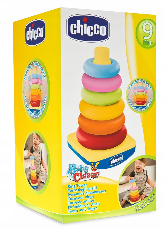 Sześć kolorowych krążków ułożonych progresywnie do układania począwszy od podstawy w górę. Zabawka rozwija umiejętności logicznego myślenia i kojarzenia oraz koordynacje manualną dziecka.