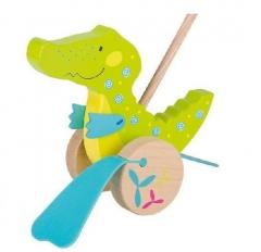Drewniana zabawka - zwierzątko do pchania. Zabawka rozwija koordynację ruchową, uczy rozpoznawania zwierząt i kolorów. Największą radość sprawia dzieciom pomiędzy 1. a 2. rokiem życia. Długość kija 62 cm.