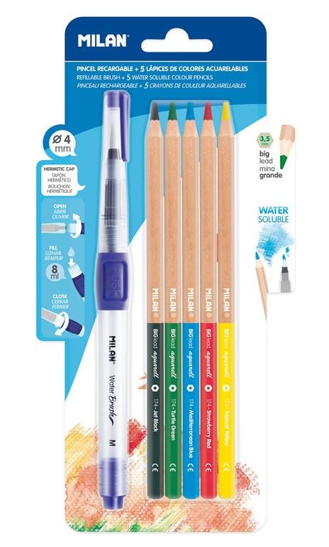 Pędzel wodny (water brush) MILAN ze zbiorniczkiem na wodę 8ml. Niezastąpiony przy pracy z akwarelami, kredkami akwarelowymi, ołówkami jaki i pastelami. Można stosować w użyciu z wodą ale także z tuszami i niemal wszystkimi rodzajami farb płynnych. Gumowy przycisk ułatwia dawkowanie płynu. Końcówka z włosia syntetycznego, średnica 4mm. Dodatkowo w komplecie kredki akwarelowe w 5 kolorach.