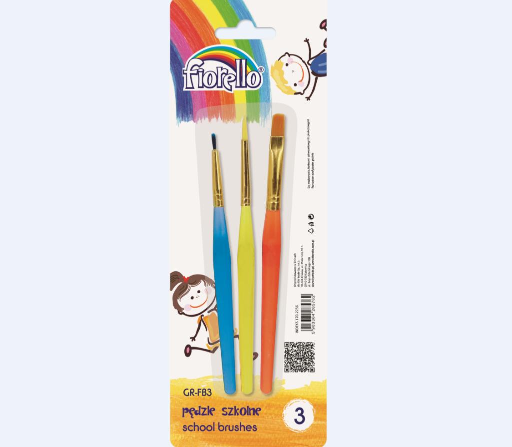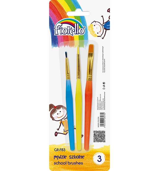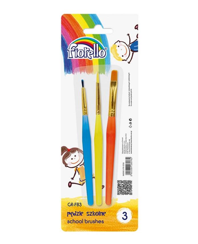 zestaw 3 pędzelków w krótkich, kolorowych uchwytach z przezroczystego plastiku nylonowe włosie w kolorze uchwytu do różnych technik malarskich poręczne mieszczą się w każdym tornistrze fasony włosia: 1 płaski, 2 okrągłe