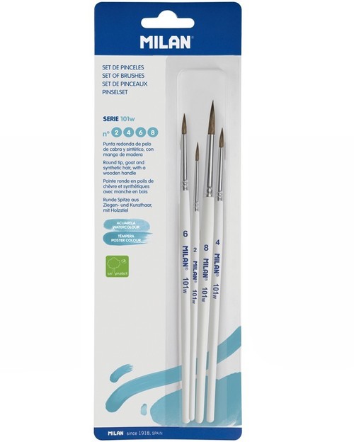 Zestaw 4 szkolnych okrągłych pędzli nr 2, 8, 12 serii 101W z krótkim drewnianym trzonkiem.