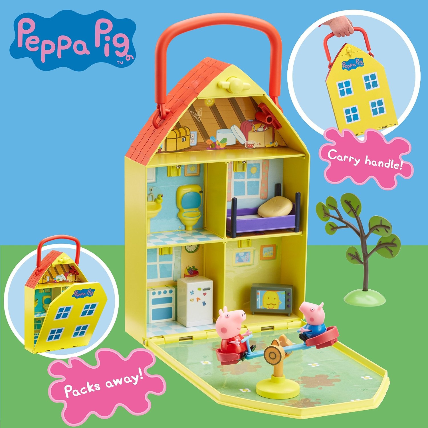 Domek do zabaw Peppy nawiązuje do bajki. By rozłożyć domek, należy przekręcić kluczyk w dachu. We wnętrzu dzieci mają do dyspozycji 5 pomieszczeń i mebelki: strych, łazienka, sypialnia, kuchnia i salon. W ogrodzie Peppa i George mogą bawić się na huśtawce. Po zabawie wszystkie elementy można umieścić w środku.