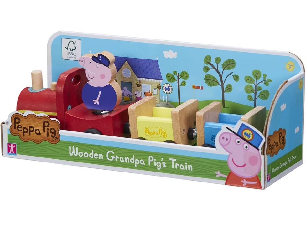 Figurka Dziadka Świnki posiada podstawkę typu drop&play, dzięki czemu można ją stabilnie ustawić zarówno w pociągu, jak i na podłodze.