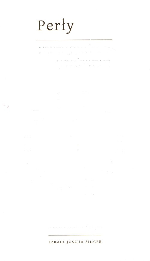Nowy zbiór opowiadań Izraela Joszuy Singera – „Perły”, to drugi zbiór tekstów brata słynnego noblisty, Bashevisa Singera, dostępny dla czytelnika nieposługującego się jidysz, ale chronologicznie starszy niż „Na obcej ziemi”. Zawiera 10 tekstów, napisanych przez bardzo młodego Izraela Joszuę w latach 1916-1922. To właśnie te utwory zapewniły mu międzynarodową karierę i rozgłos w Stanach Zjednoczonych.