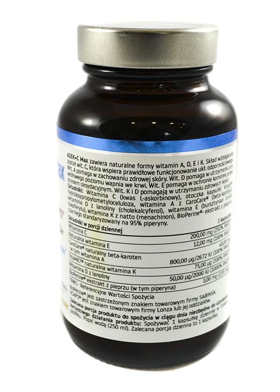 Suplement diety ADEK + C Max zawiera naturalne formy witamin A,D,E i K. Skład wzbogacony został witaminą C, która wspiera prawidłowe funkcjonowanie układu odpornościowego oraz ekstraktem z pieprzu czarnego BioPerine®. Pieprz czarny wspiera trawienie i wchłanianie składników odżywczych.