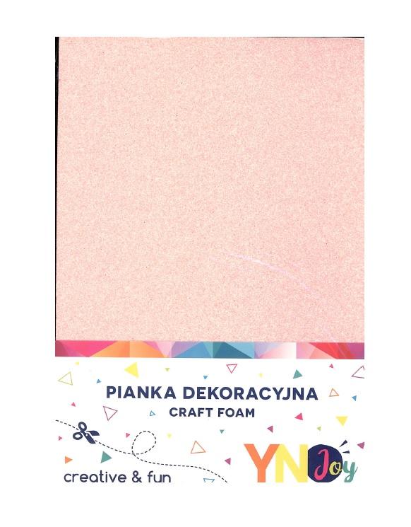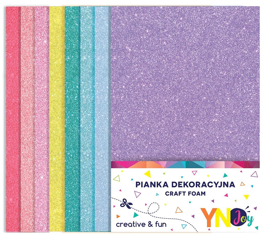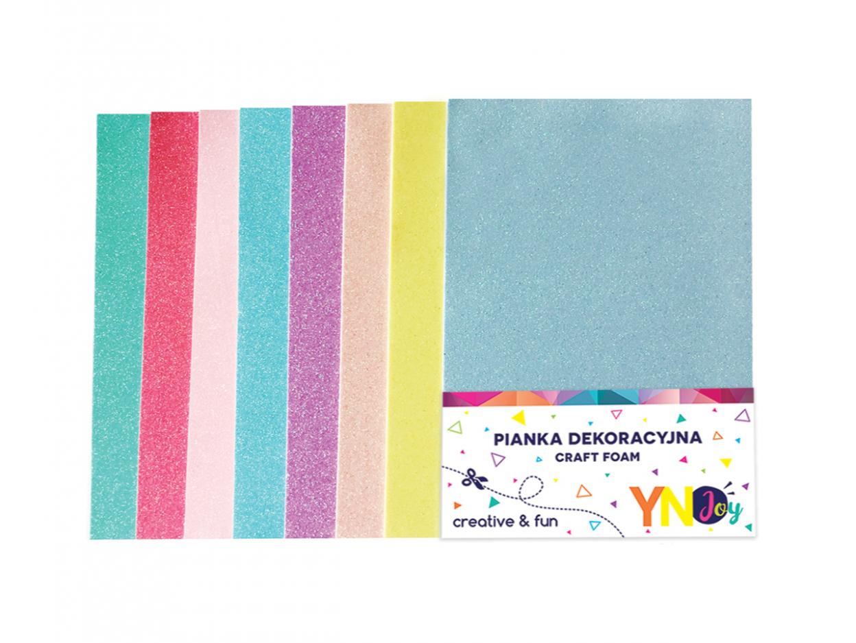 Opakowanie zawiera 8 arkuszy pianek w rozmiarze A4 w pastelowych odcieniach jednostronnie pokrytych brokatem.