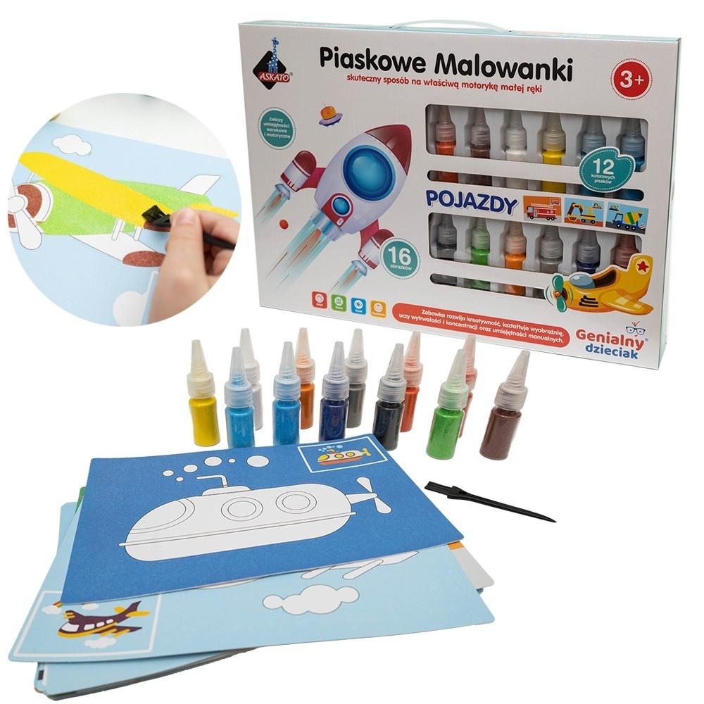 Piaskowa posypywanka Księżniczka 16 obrazków, 12 kolorów piasku, pędzelek, podkładka Wymiar obrazka: Wymiary opakowania: 40.3 x 4.5 x 28.5 cm Wiek 3+