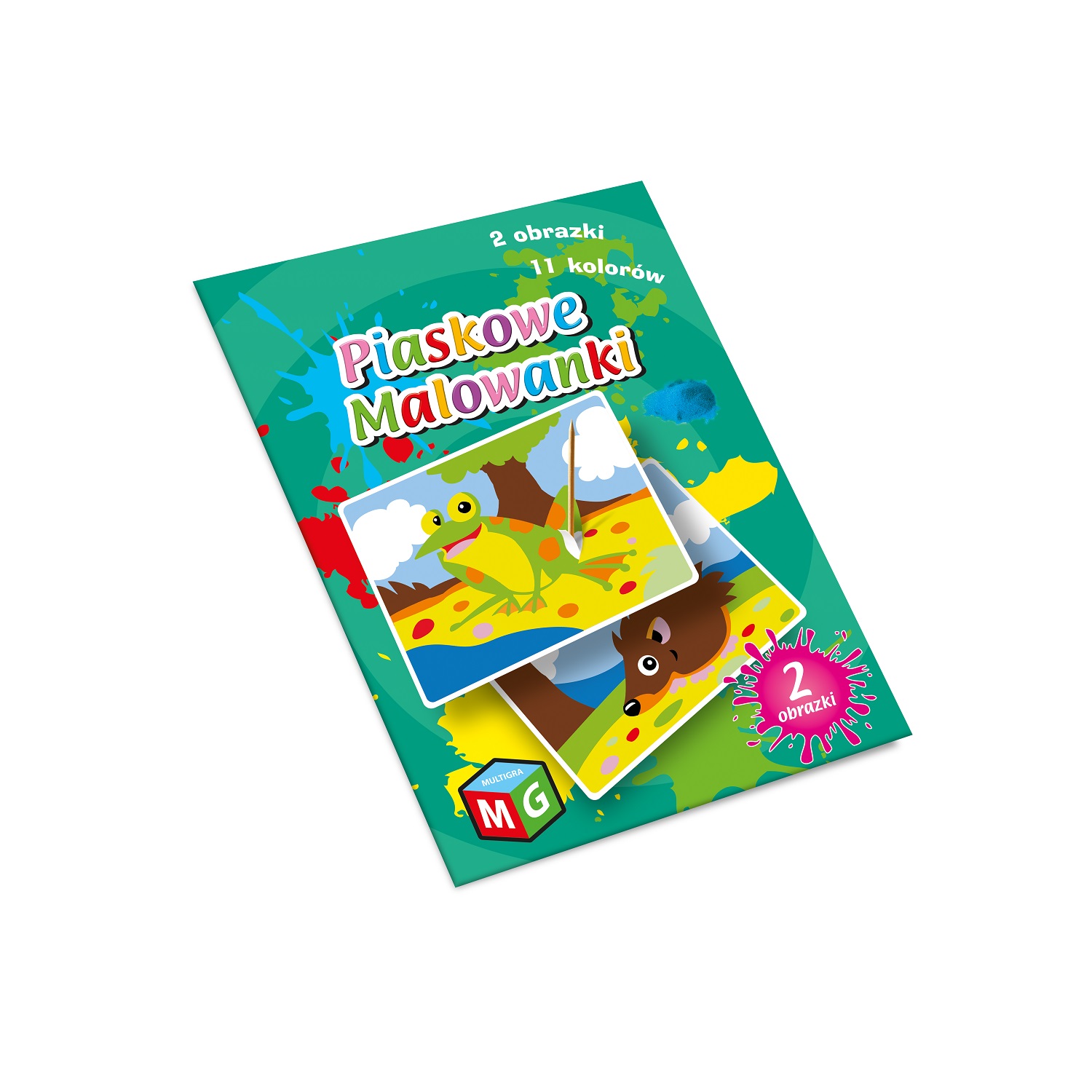 Zawartość pudełka: 2 obrazki do kolorowania, patyczek, 10 woreczków kolorowego piasku, instrukcja.
