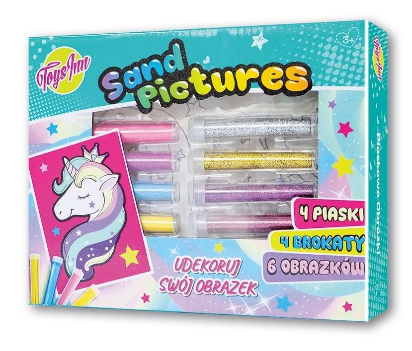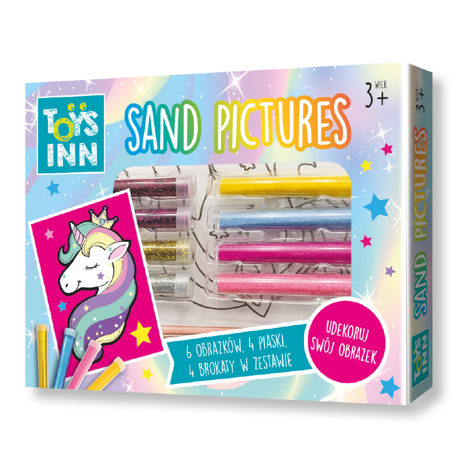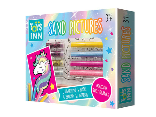 Zestaw piaskowych obrazków Unicorn to wspaniała, kreatywna zabawa dla młodszych dzieci. Zestaw zawiera 6 obrazków pokrytych klejem, dzieki czemu wystarczy na dany obrazek nanieść 4 kolory piasku lub brokatu, by stworzyć niepowtarzalną kompozycję.