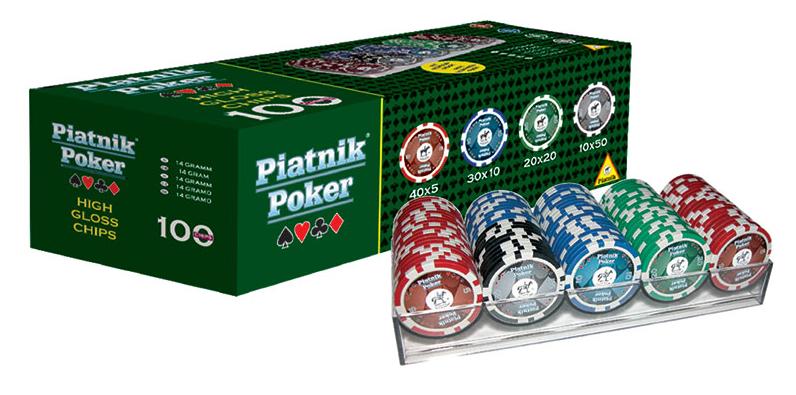 100 sztonów w plastikowym, przezroczystym etui. Żetony z nominałami, waga po 14 g, na każdym logo Piatnika.