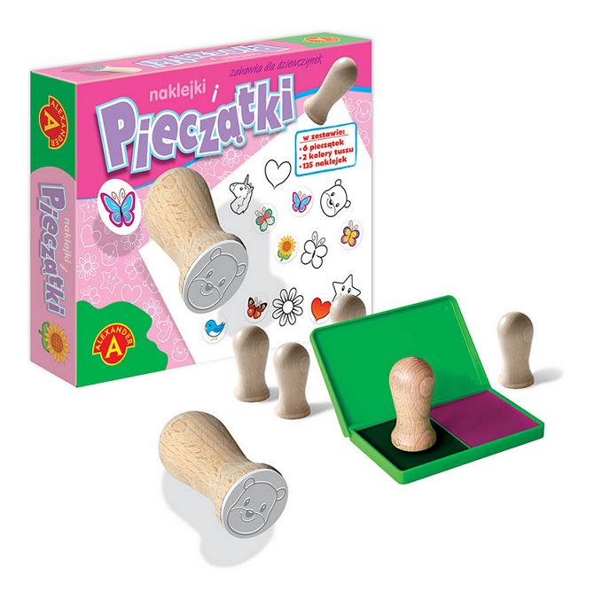 Zestaw kreatywny dla dzieci składający się z 6 pieczątek z ulubionymi motywami dziewczynek (motylek, serduszko, miś, jednorożec, kwiatek, gwiazdka), które można odbijać na kartce czarnym i czerwonym tuszem z poduszek znajdujących się w specjalnym, plastikowym pudełku. Odbite kształty można kolorować kredkami lub dodatkowo ozdabiać nimi swoje rysunki. 135 kolorowych naklejek urozmaica zabawę. Wszystkie elementy znajdują się w eleganckiej, funkcjonalnej wyprasce.