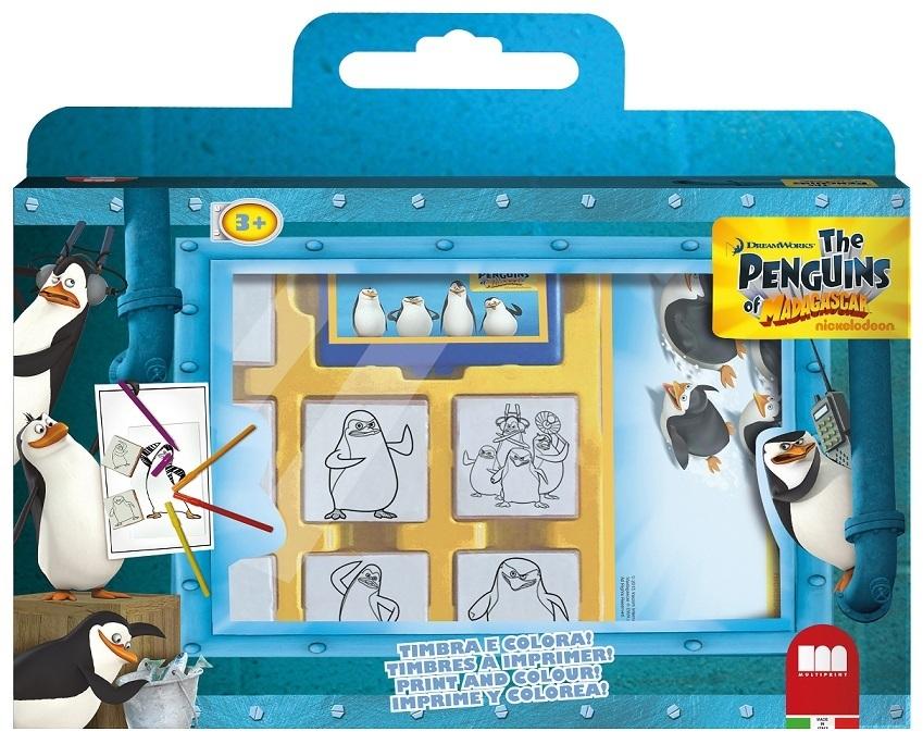 Zestaw pieczątek w walizce z akcesoriami Pingwiny z Madagaskaru: 7 pieczątek, wykonanych z drewna i kauczukowej gumy, pudełko z tuszem oraz pisaki do kolorowania.