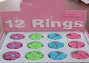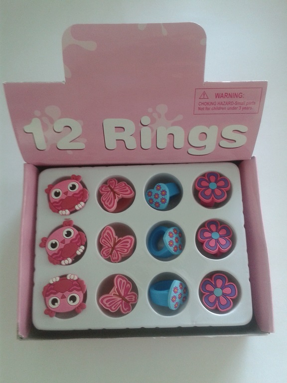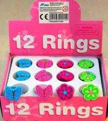 12 sztuk gumowych pierścionków w opakowaniu, do wyboru cztery wzory: niebieski motylek, różowy motylek różowy kwiatek, zielony kwiatek.