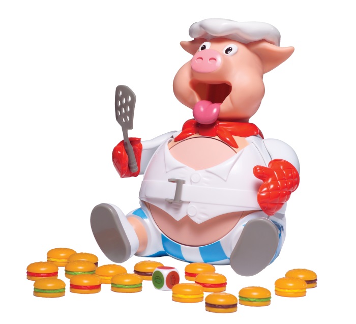 Piggy Pop humorystyczna gra dla najmłodszych! Nie pękaj Prosiaczku! Panowie i Panie ile hamburgerów prosiaczek jest zjeść w stanie? Każdy połknięty hamburger powoduje, że puchnie mu brzuch. Rzut kostką- Łap hamburgera -przełknij teraz Twój ruch! Rosną emocje i puchnie mu brzuszek. Kto przesadzi, spowoduje, że pęknie fartuszek? Humorystyczna zabawa z wielkimi emocjami i salwami śmiechu dla małych i dużych dzieci w wieku od 4 lat. Na koniec gry każdy się dowie, czy jedzenie w nadmiarze wychodzi na zdrowie! Im więcej je, tym grubszy się staje!Opis rozgrywki : Rzuć kostką i wybierz hamburgera w odpowiednim kolorze. Naciskaj głowę prosiaczka za każdym razem, gdy go karmisz, (ilość wciśnięć odpowiada wartości na spodzie hamburgera). Patrz jak jego brzuszek robi się coraz większy, większy i WIĘKSZY!