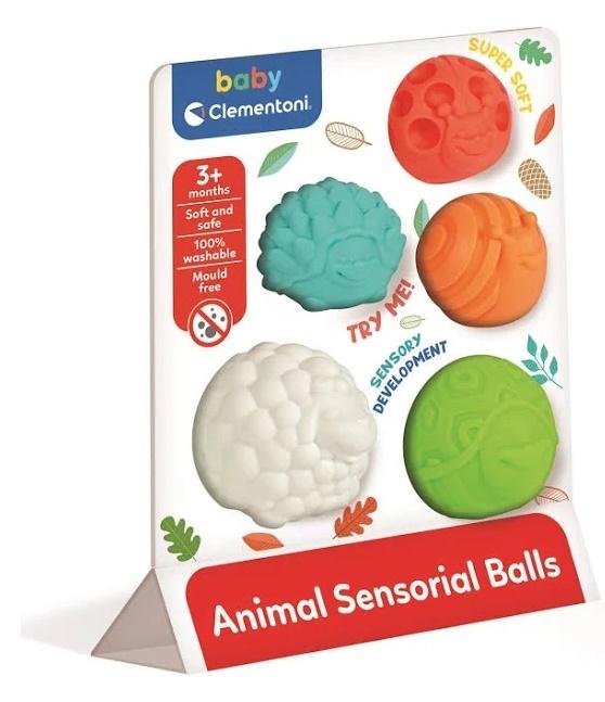 Zestaw pięciu miękkich piłeczek w kształcie zwierzątek.