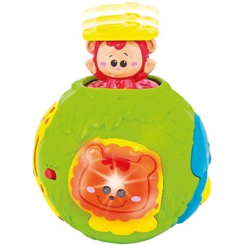 Kula z niespodziankami Aktywizuje zabawę dziecka dzięki różnym niespodziankom. Naciśnij lwa, a wyskoczy małpka. Lew zaświeci i wyda śmieszne odgłosy. Przesuwaj koraliki żyrafy, obracaj kulą słonia. Nauka pełzania, raczkowania i chodzenia Podążanie za toczącą się kulą zachęci maluszka do ruchu i ułatwi mu trudną sztukę pełzania, raczkowania i chodzenia. Wspomaga rozwój małej motoryki Dotykanie, naciskanie, przesuwanie i obracanie elementów zabawki usprawni rozwój małej motoryki sprawność dłoni i paluszków . Mówi po polsku. Lew świeci i wydaje śmieszne odgłosy. Koraliki żyrafy przesuwają się. Obrotowa kulka w środku słonia wydaje dźwięki. Regulacja głośności. Wiek dziecka 6m Wymiary opakowania 18 x 22.5 x 16 cm Wymagane baterie 2 x AA 1,5V Dołączono baterie testowe Opakowanie stanowi element produktu.
