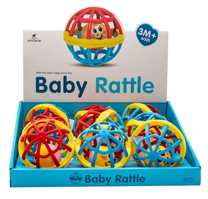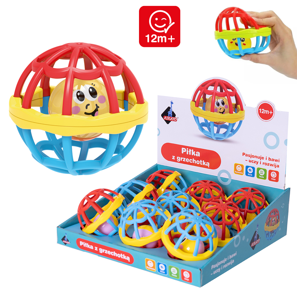 PIŁECZKA Z GRZECHOTKĄIdealna zabawka dla malucha, bowiem ma wpływ na integrację sensoryczną dziecka, rozwija zmysł dotyku, wzroku oraz słuchu.Niebieska i czerwona część jest gumowa, dzięki temu dziecko może ją delikatnie zgniatać. Uśmiechnięta buźka w środku piłeczki jest grzechotką. Łączenie gumowych części piłeczki jest wykonane z plastiku.Średnica piłeczki 10 cmWiek: 6