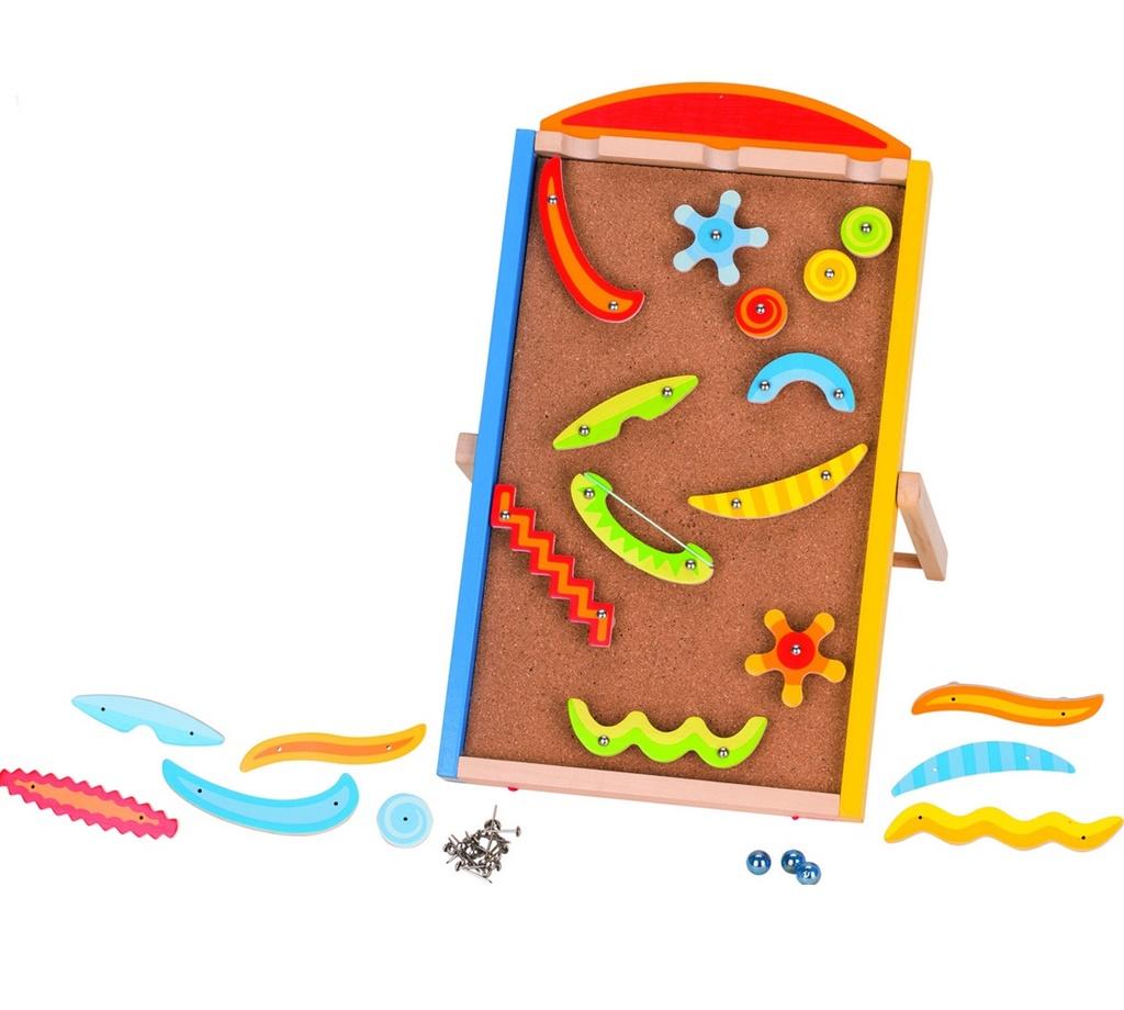 Flipper, czyli pinball to kolejna nowość wśród produktów Goki w 2019r. Dziecko dowolnie ustawia przeszkody, po czym wrzuca piłkę od góry na planszę. Cel: piłka ma wpaść w 1 z 3 zagłębień falistego elementu na dole planszy. Można grać 3 piłkami naraz! Zabawka została wykonana z drewna i korka. Goki to producent drewnianych zabawek dla dzieci, które wyróżnia styl, żywe kolory, wysoka jakość i innowacyjność. Produkty Goki wspierają rozwój sensoryczny i motoryczny dziecka, skłaniają do logicznego myślenia, a rodzicom pomagają tworzyć zrównoważony styl zabawy bez hałasu i plastiku.