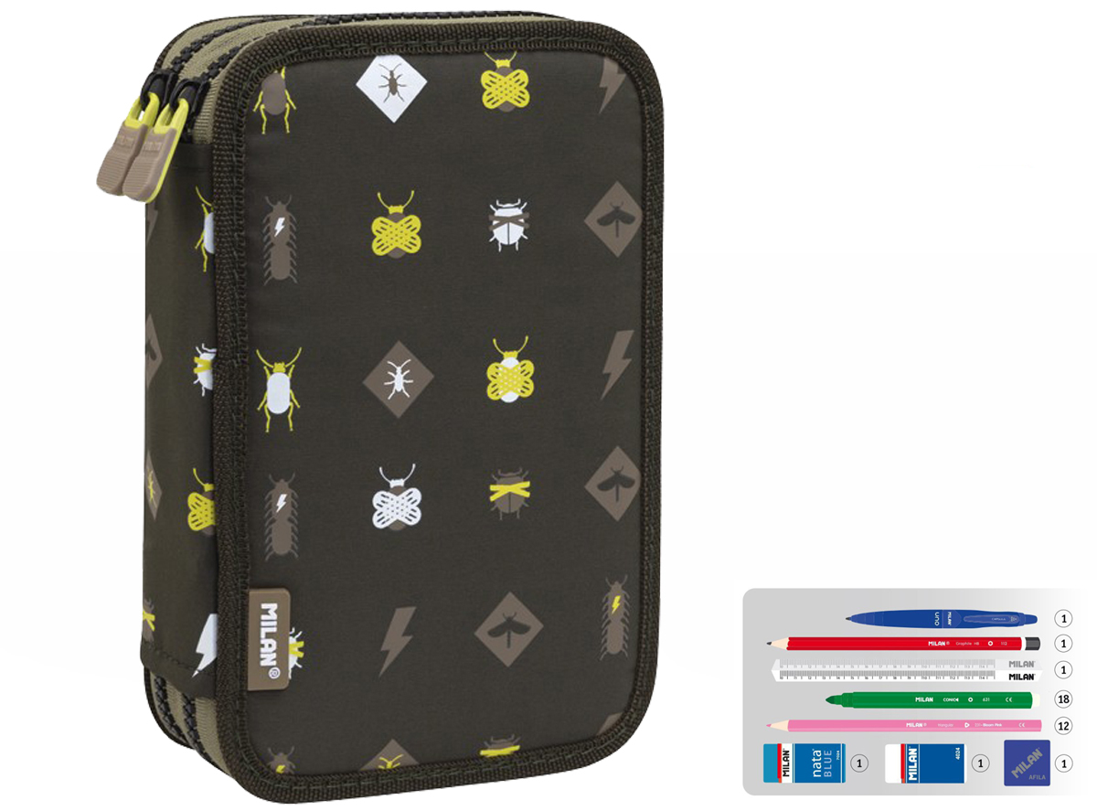Piórnik piętrowy z wypełnieniem. Seria specjalna Be Atomic, kolor czarny. Zawartość: 2 gumki do ścierania (4024 i niebieski Nata), 1 temperówka AFILA, 1 ołówek grafitowy HB, 1 niebieski długopis CAPSULE Uno, 1 linijka 15 cm, 12 trójkątnych ołówków kolorowych, 18 stożkowych długopisów. Skład: poliester na zewnątrz i wewnątrz podszewka. Rozmiar: 19,5 x 13 x 5 cm.