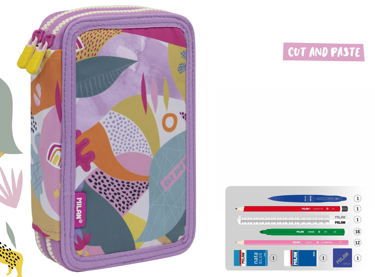 Wyposażenie w całości składa się z oryginalnych produktów MILAN: długopis CAPSULE UNO niebieski, ołówek sześciokątny HB, linijka trójkątna 15 cm, 18 flamastrów, 12 kredek trójkątnych, temperówka, 2 gumki do ścierania. Przy produkcji piórników użyto najlepszych materiałów, bardzo wytrzymałych suwaków oraz wzmocnionych nici. Niepowtarzalne wzornictwo. Wymiary piórnika: 19,5 x 13 x 5 cm. Nowość: materiał wierzchni i podszewka 100% poliester z recyklingu. Zużyte butelki plastikowe są przetwarzane w przędzę poliestrową pochodzącą z recyklingu, aby stworzyć materiał na nasze saszetki, piórniki, torby i plecaki.