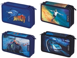 Piórnik podwójny na zamek, 23 częśći: 8 kredek, 8 flamastrów, 2 ołówki HB, długopis, gumka, temperówka, linijka, ekierka. Seria Boys, mix wzorów.