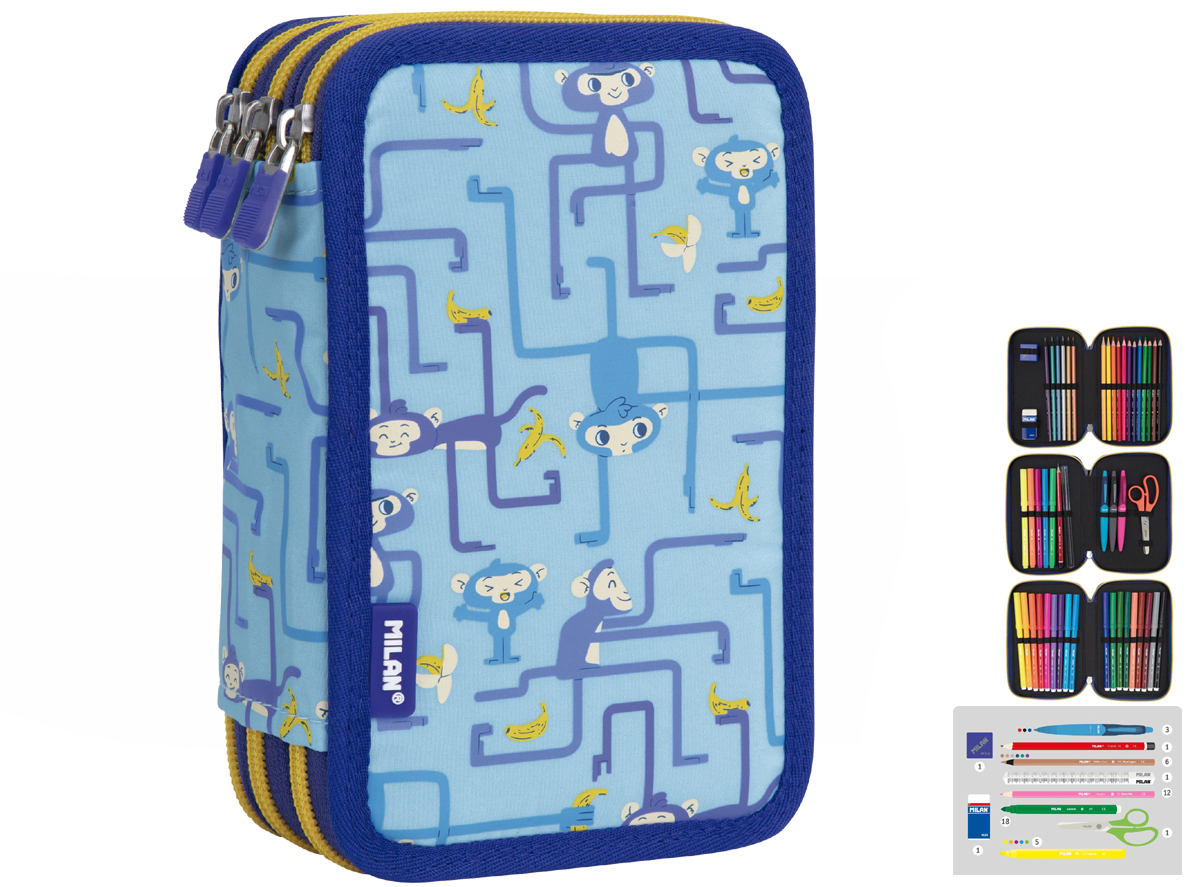 Piórnik piętrowy, dzięki któremu przybory szkolne będą zawsze uporządkowane i łatwo dostępne. Specjalna seria Tangled Monkeys, kolor niebieski.