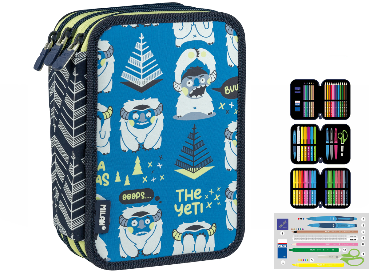 Piórnik 3 poziomowy z wyposażeniem marki MILAN. Piórnik wyróżnia się żywą kolorystyką i grafiką z zabawnymi stworami Yeti. Każda przegroda zamykana jest na suwak.