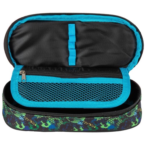 Wewnętrzna klapka posiada gumkę na 5 sztuk przyborów do pisania, dodatkowo w piórniku znajduje się klapka z gumką na 4 sztuki przyborów oraz kieszonką z siateczki zapinaną na zamek.