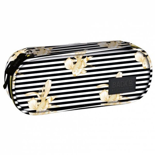 Piórnik BackUP model A 16 wzór inspirowany najnowszymi kolekcjami włoskich projektantów, bardzo elegancki poprzez połączenie biało czarnych pasków ze złotem. Taki wzór na pewno przynosi szczęście przedstawiając tak dużo złotych rybek...
