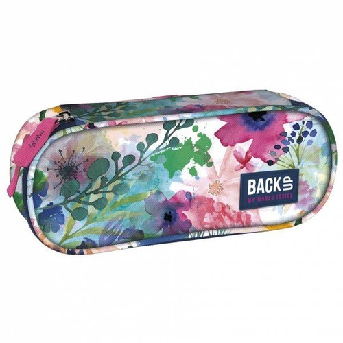 Piórnik BackUP model A 28 w nasycone kolorami, akwarelowe kwiaty przywodzące na myśl romantyczną, wiosenną łąkę, wykończony granatowymi zamkami, które dopełniają całości.