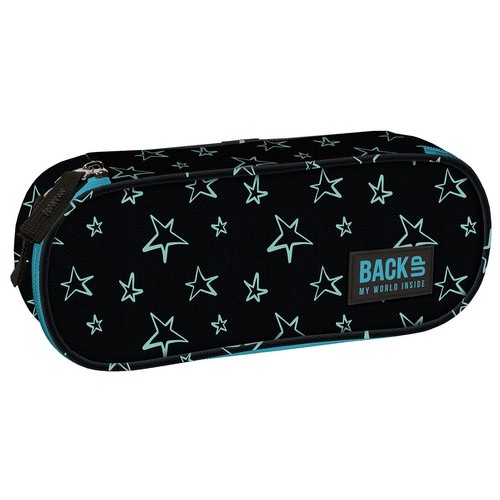 Piórnik BackUP model A 33 w turkusowe, jasno świecące gwiazdy na ciemnym tle. Stonowany wzór podkreślony przez turkusowy zamek oraz naszywkę z logo BackUp.