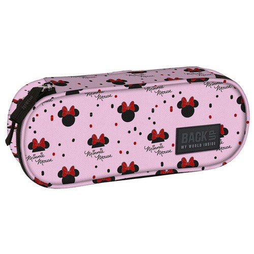Piórnik BackUP model A MINNIE 90 ponadczasowy wzór w kolorze delikatnego różu z czarnymi postaciami Myszki Minnie z nieodłączną, czerwoną kokardką.