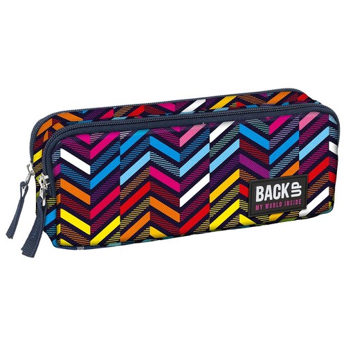 Piórnik BackUP model B 10 to wzór o przestrzennym kształcie kolumn ułożonych z różnokolorowych klocków, układających się w jodełkę, tworzących wielobarwną i innowacyjną mozaikę.